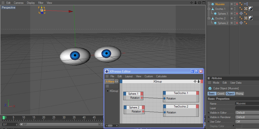 Qui entra in gioco il tag XPresso, il quale permette di trasferire la rotazione della sfera con target alla mappatura sferica della texture sull'occhio ovale.