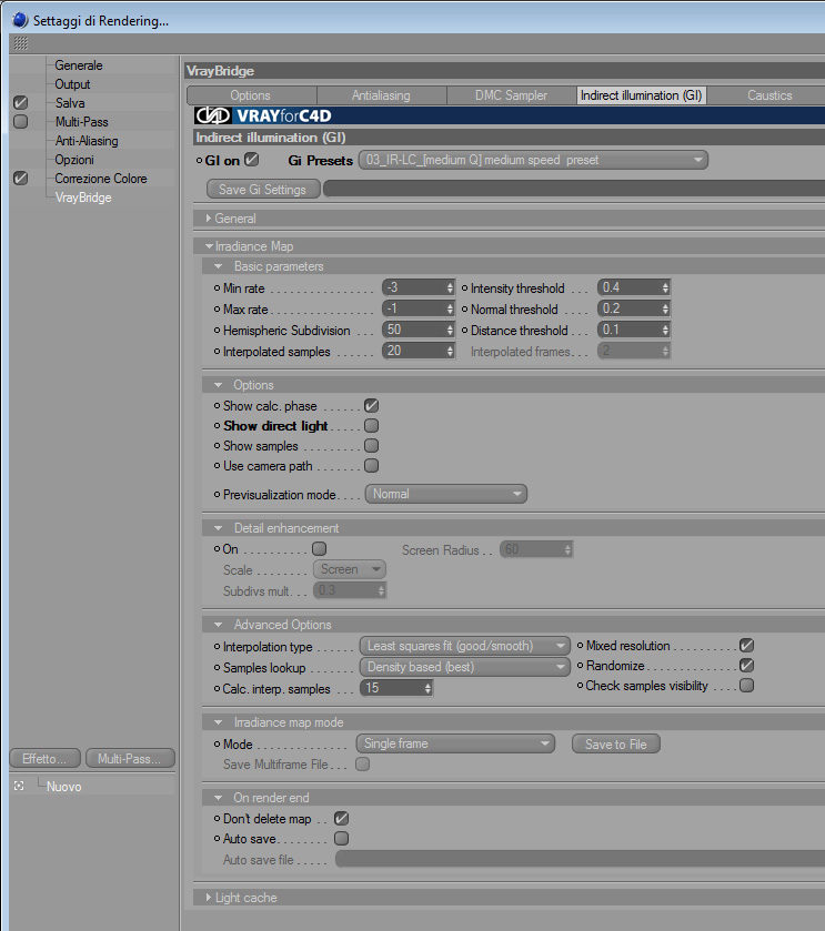 Aumenta i valori Hemispheric subdivision nell'irradiance map, porta l'intensity threshold ad un valore di almeno 0,3, i valori di light cache quali sono?