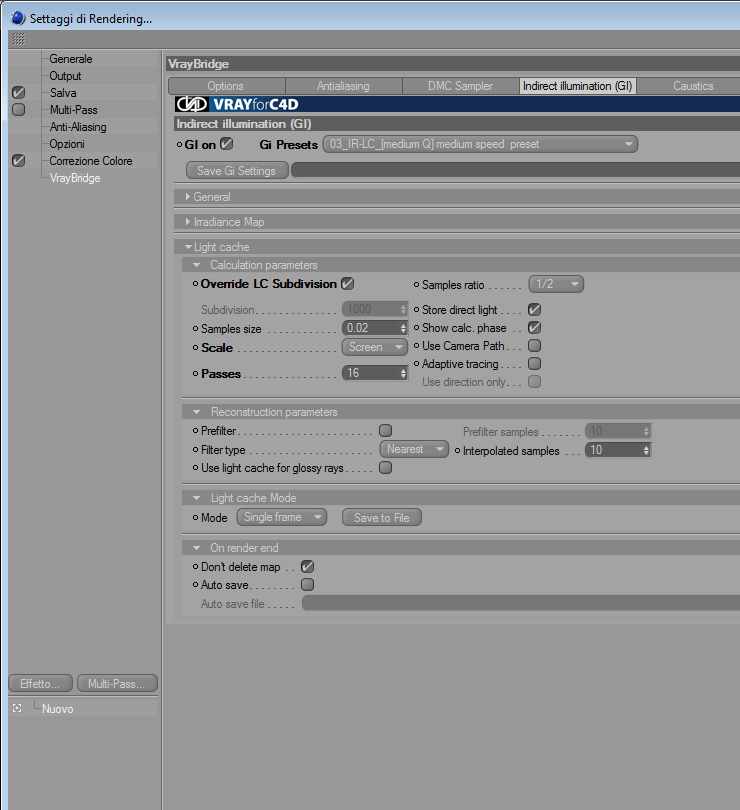 Aumenta i valori Hemispheric subdivision nell'irradiance map, porta l'intensity threshold ad un valore di almeno 0,3, i valori di light cache quali sono?
