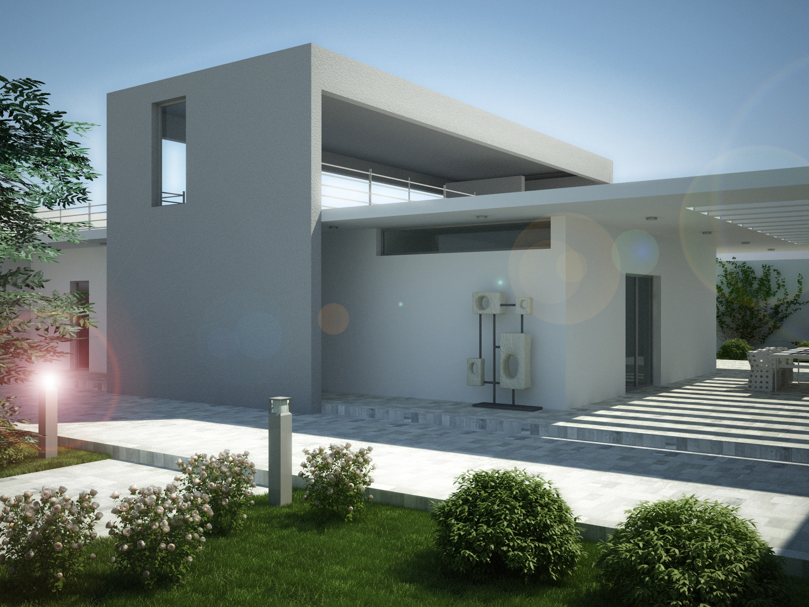 per la vista con i faretti accessi farei il cielo più scuro e farei far luce hai corpi luminosi del giardino.