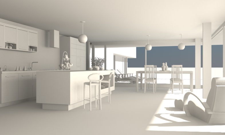 Personalmente sposterei la luce del sole sull'angolo delle due vetrate e la metterei bassa in modo che entri in profondità nella stanza allungando le ombre e evitando tutta la parte in ombra che hai adesso.