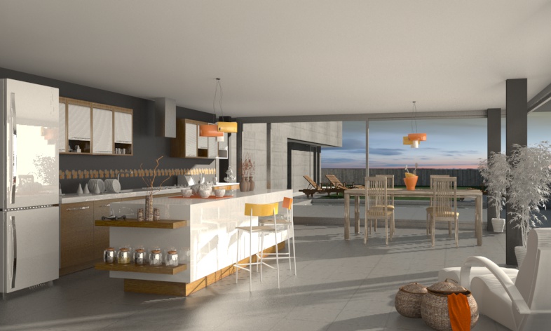 ora finisci con i materiali, sistema l'anti-aliasing che è basso (vedi ombra del bancone subito in basso sulle piastrelle) e per me togli i ricamini sul muro della cucina :)