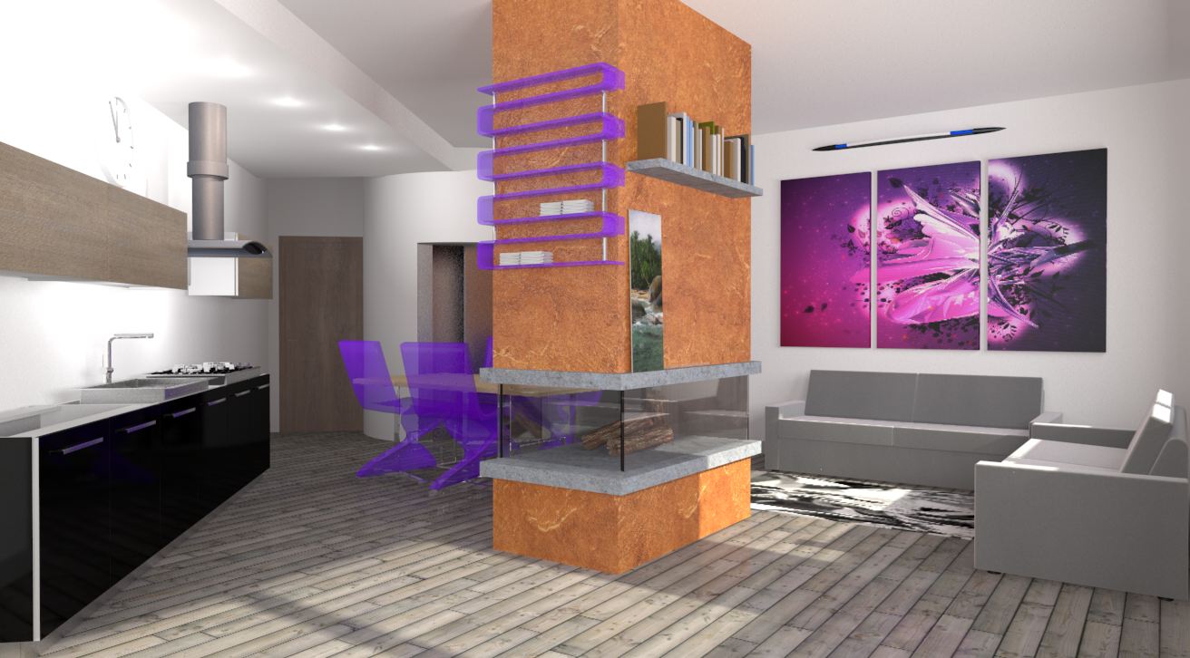 piccola parentesi architettonica, se mi è permessa. Il camino come ingombro nella parte superiore è probabilmente eccessivo, per una cappa media basta uno spazio decisamente minore, quindi invece che inserire mensole e elementi vari potresti pensare di scavare il volume di base rettangolare come una scultura che possa avere degli incavi utili per inserirci oggerri vari, come i libri, potresti fare tipo un mobile-camino, non so se mi sono spiegato. D' altronde nel tuo progetto il camino assume un importanza fondamentale essendo elemento centrale dello spazio (un po' una concezione Wrightiana del soggiorno), e in quanto tale può anche assumere un valore formalmente importante. Il controsoffitto io lo utilizzerei per valorizzare la differenza funzionale dello spazio, cioè in cucina lo farei lievemente più basso, colore vivace per dare un senso di "attivo", e illuminazione dall' alto. Per la zona giorno utilizzerei dei colori meno vivaci e un controsoffitto piu alto, per accentuare il contrasto fra le 2 zone, pur essendo il tuo un open space.In questo modo puoi riprendere la concezione lecurbusieriana del soggiorno dove lo spazio di dilata al fine di favorire l' apertura degli stati d' animo degli utenti della zona, e cosi abbiamo messo dentro il tuo progetto 2 mostri sacri dell' architettura contemporanea. Inoltre da quel che vedo tu hai 2 elementi di differenziazione rispetto alla geometria triangolare dello spazio, il primo è ll' ingresso semicircolare che valorizzerei con un materiale a parte, e il secondo che è il camino. Intorno a questi 2 elementi costruirei il progetto, il conrtosoffitto potrebbe bucarsi per far spazio a una luce che illumina gli elementi dall' alto, non so se mi sono spiegato, gli elementi suddetti potrebbero bucare il controsoffitto stesso. Terzo consigio, e prendiamo il terzo mostro sacro Mies, "less is more", cioè farei una cosa molto sobria per enfatizzare gli spazi stessi, senza rivestimenti eccessivi, utilizzando pochi colori molto contrastati. Buon lavoro!!!!