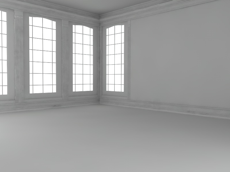 quindi tornando al discorso....ho aggiunto una luce con target per mandare i raggi del sole nella camera lasciando sempre l'environment accesso e tutto bianco e ho aggiunto dei muri ai lati della camera per non far entrare troppa luce perche' bruciava troppo.....cosi'(penultima immagine)