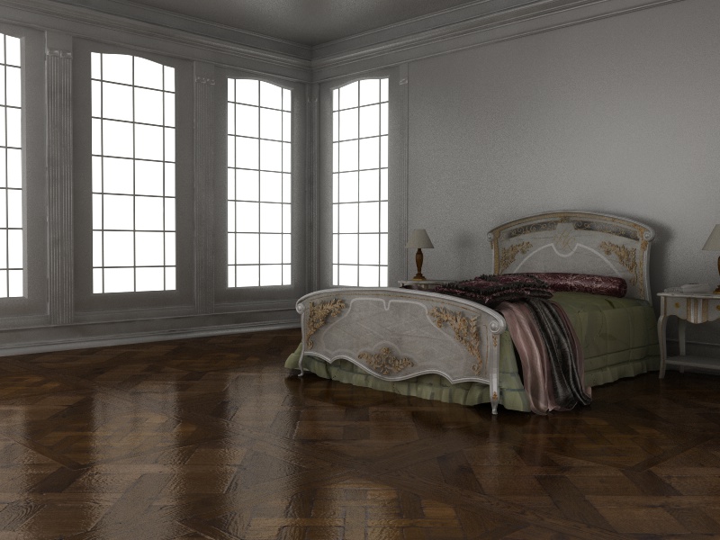ho aggiunto poi i tavolini con relative lampade e telefono ai lati del letto e ho cominciato a dare un po' di colore al tutto. per il muro e le finestre, che dovrebbero essere fatte di una specie di legno bianco, ho usato un semplicissimo bianco con un leggero spec e molto refl gloss...per i tessuti ho fatto lo stesso per farli sembrare tipo di raso o seta o insomma giu' di li'.il parquet invece e' un parquet semplice semplice trovato su internet con un leggero bump e un po' di spec. il letto l'ho un po' modificato io, i cuscini invece li ho scaricati tutti da archibase.Sul letto ho anche aggiunto la scritta HR..non so che significa pero' visto che ci stavo ce l'ho messa.