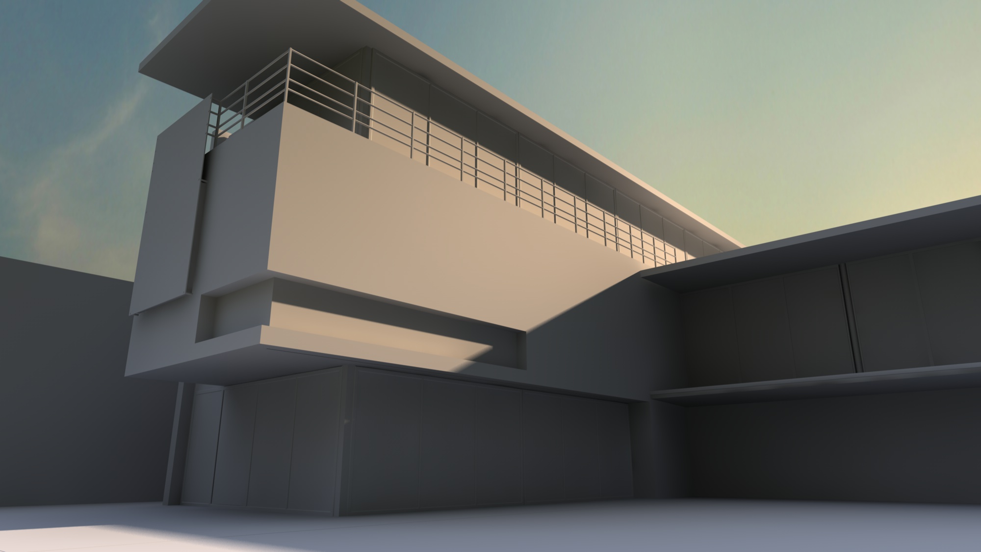 Si, ho fatto prove solo con il cielo e hdri e ho visto che si può illuminare solo con quello. Però volevo dare all'immagine delle ombre un po' più marcate, come se ci fosse il sole, e perciò ho messo una luce infinita con ombre. Beh, in sostanza sto usando come modello prova la Casa Fuentes, che altri stanno usando per il laboratorio rendering. Ti posto una immagine di quello che intendo fare: c'è una luce infinita + cielo con HDRI (dalla libreria interna di cinema). -per inciso, sto tentando di fare qualcosa che possa assomigliare ad un'alba, per quello il sole è così poco forte-62VAMPIRO ha scritto:mentre la presenza anche di una luce infinita potrebbe portare ad influenzare la gamma cromatica (la luce ambiente) rendendo il tutto incoerente.