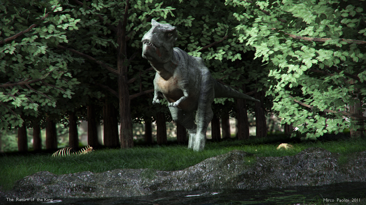 Io migliorerei lo shading del t-rex: aggiungi bump/normal o displacement map ed anche una specular map.. la pelle è piuttosto piatta e plasticosa.. ma ripeto: buona modellazione
