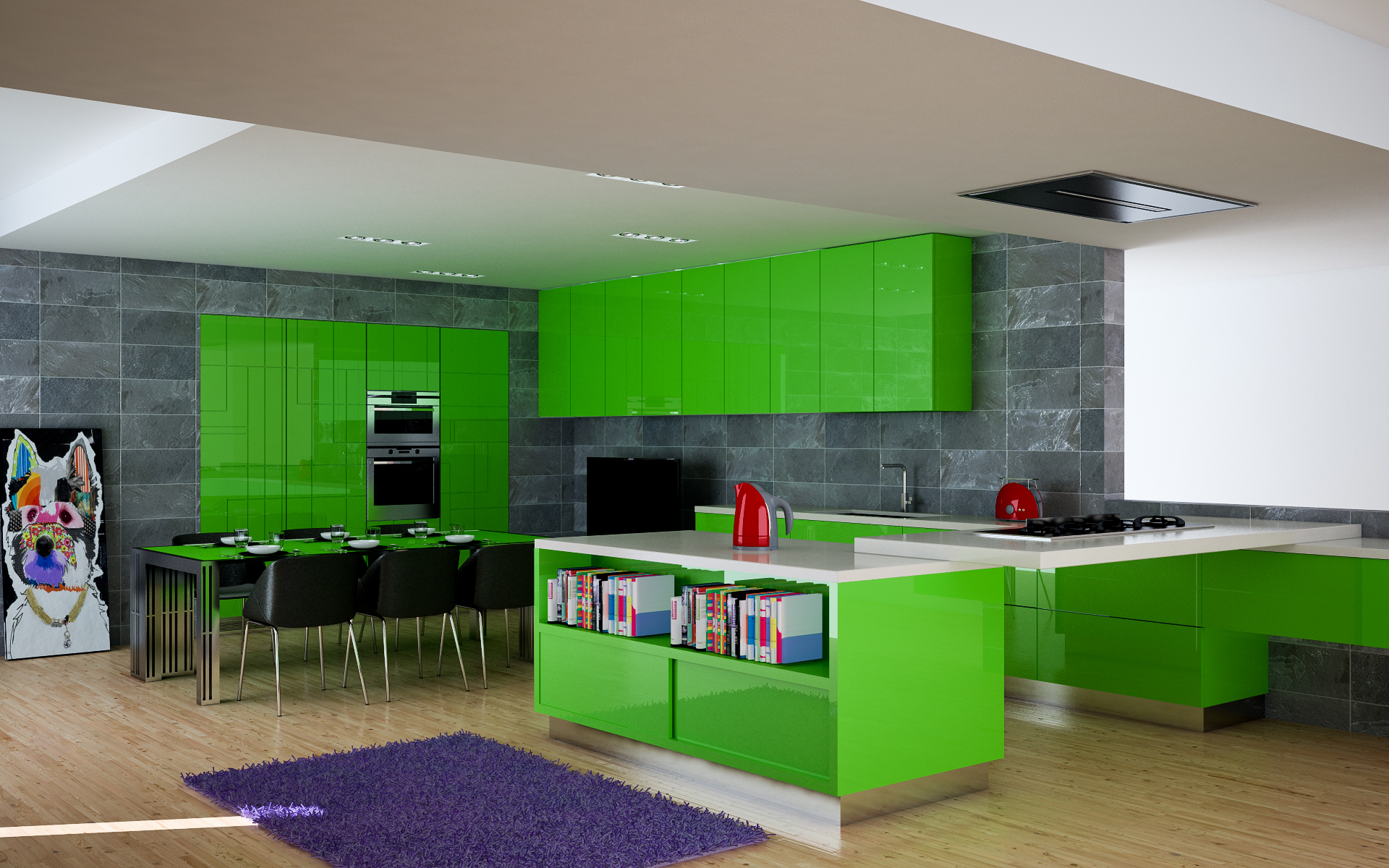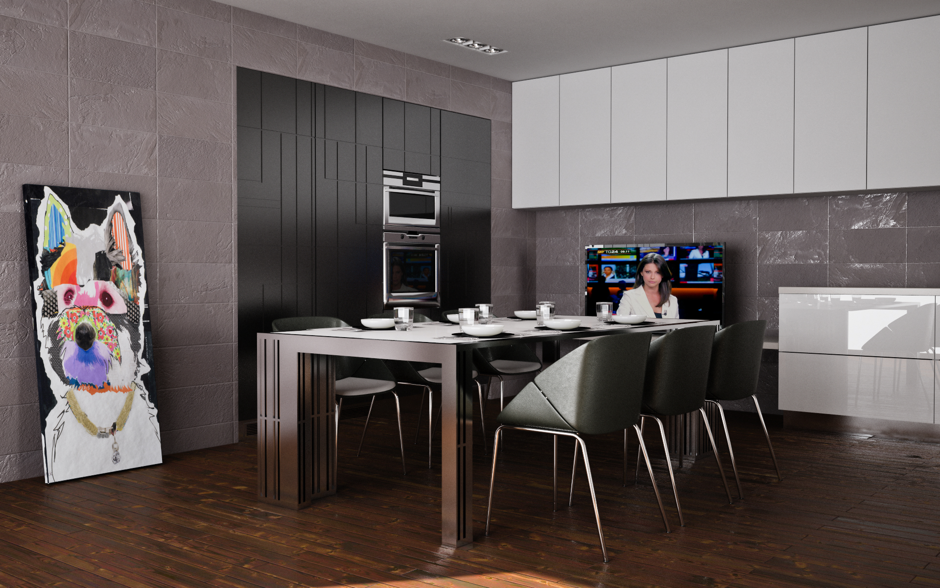 Ridurrei leggermente il bump sulle mattonelle a perete e darei un tocco di specularità/riflessione ai pensili bianchi.