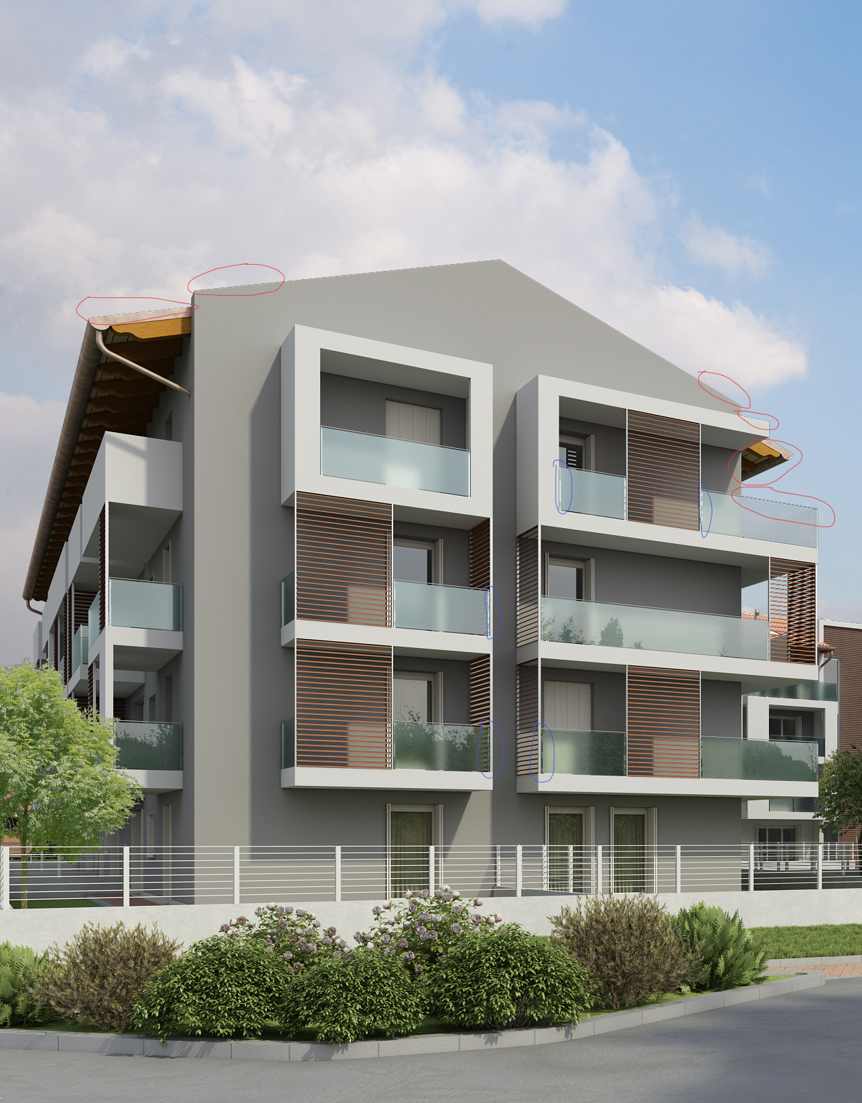 Sto realizzando un esterno a cui vorrei dare un dettaglio curatissimo nelle linee di definizione deglio oggetti, ma ottengo delle seghettature pfiu (evidenziate in rosso) e un problema di distorsione nei parapetti in vetro :( (evidenziati in blu), chiedo consigli a voi esperti del forum, grazie in anticipo. ;)