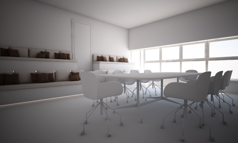 Questa bozza di scena è illuminata solo da una infinite light / vray physical sun più le area light lineari sotto le panche, come potrete notare risulta sovraesposta nella zona finestra e sottoesposta nei punti più distanti.