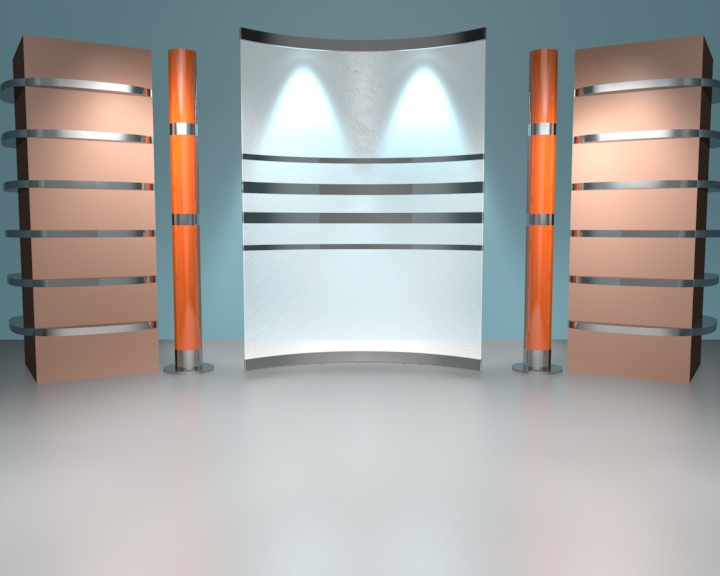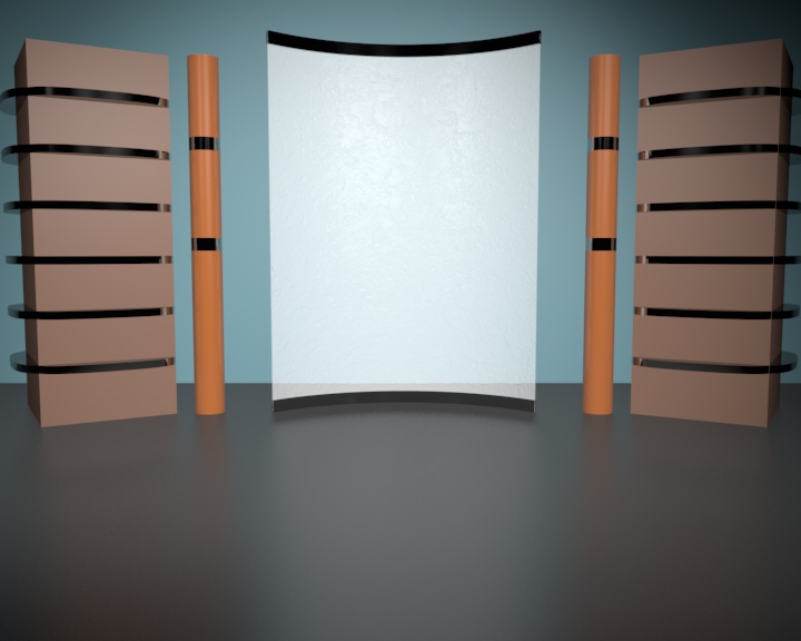 Per quanto concerne la disposizione delle luci: ho due spot IES che illuminano la parete di fondo azzurrina, due spot IES che illuminano i due prismi "rosa" ai lati ed uno spot (normale) che mi illumina il pavimento.