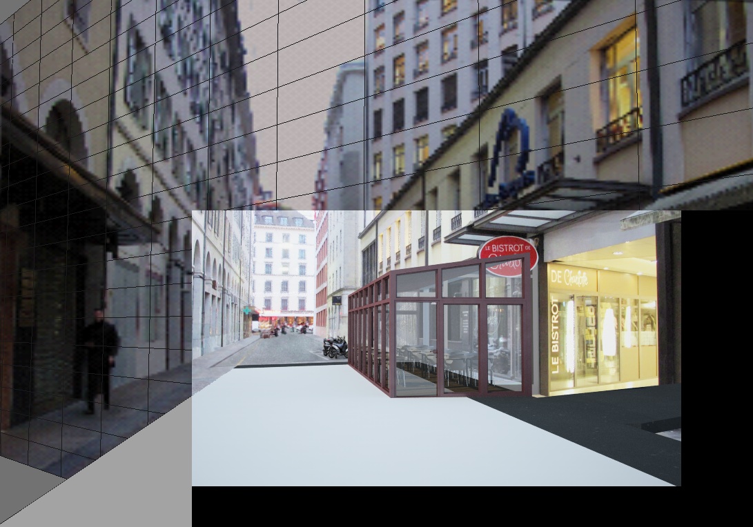 Quello che mi piacerebbe fare è l'effetto chiarore interno tipico di un bar, e quindi mi genererà delle ombre sulla piazzetta che vedrò poi di isolarle e di metterle sui ciottoli reali in PS.