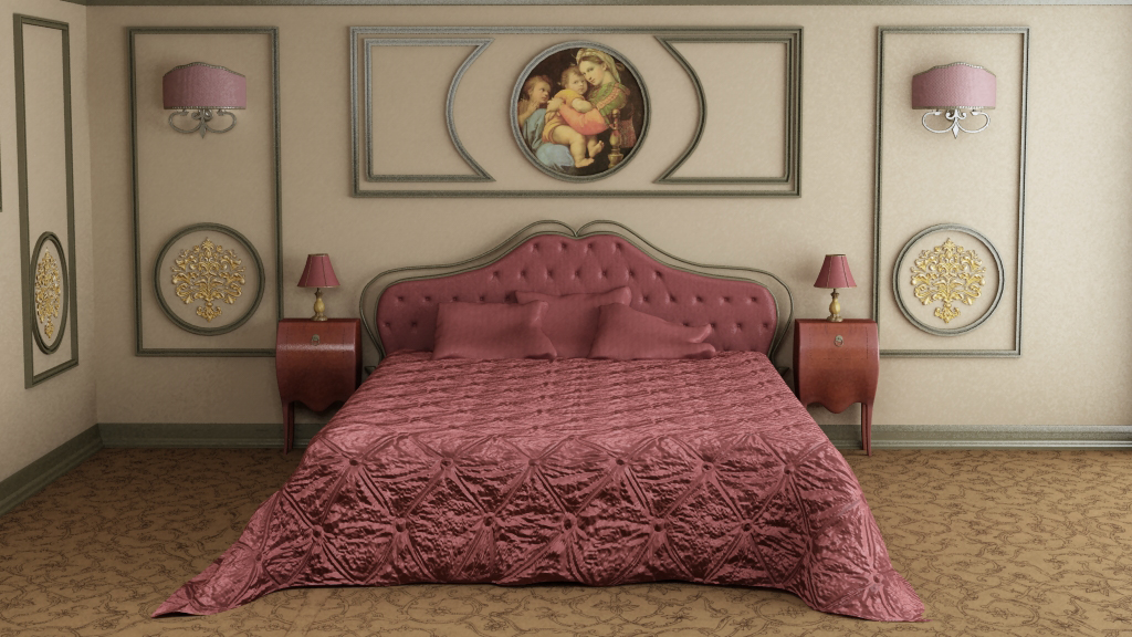 Grazie morph. Mi hai letto nel pensiero. Proprio stasera ho deciso di togliere quella panca e modellare un mobile in stile barocco. intanto vi posto un piccolo up, con le lampade sui comodini. Modellate in cinema e rifinite in zbrush.