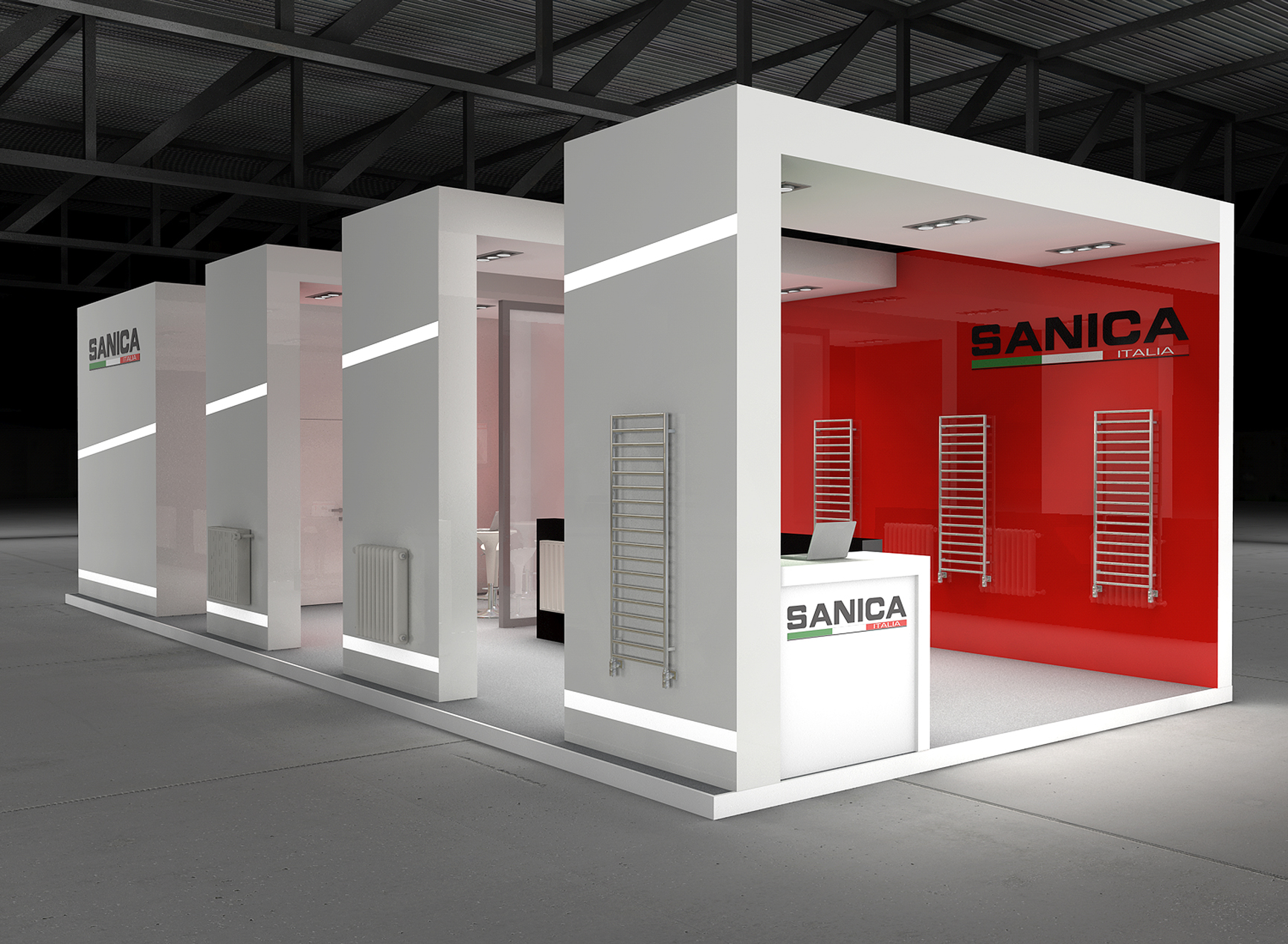 Inserisco lo stand in un padiglione e come base lo circondo di luci area con decadenza poi una luce area sopra. Per finire metto i faretti con la luce spot puntata su logo o prodotti.
