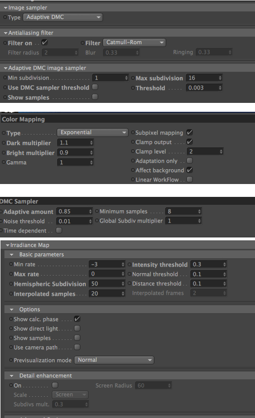 e come vedi dallo screenshot ho usato 4 luci are, abbastanza forti, per illuminare. Mi son servito anche dell'enviroment (GI envorment) per schiarire il tutto.