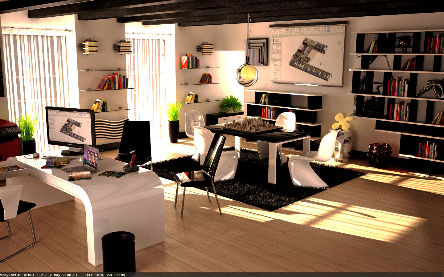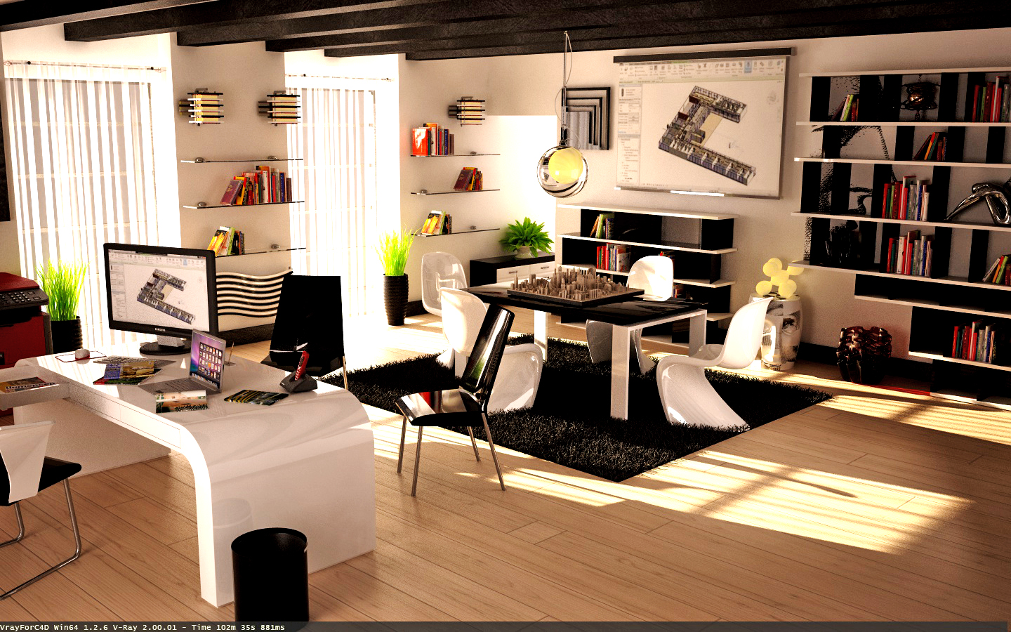 Tralasciando l'eccessiva illuminazione che brucia estremamente la zona finestre... e i diversi contrasti/materiali che fanno perdere i dettagli in molte zone della stanza... siamo nuovamente sempre al solito discorso... come già precedentemente detto più che uno studio d'architettura sembra più la stanza di un giovane ragazzo adolescente... e di minimale oltre ai colori vedo ben poco... cerca spunti in internet da altri uffici di architettura... e poi segui una "retta via"...