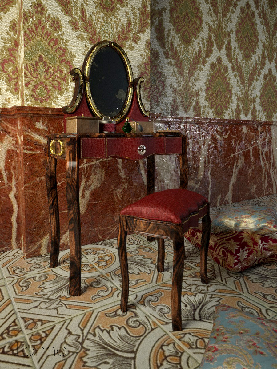 qui la prima cosa che mi balza all'occhio..e che trovo spezzi notevolmente la scena è la coperta in velluto in primo piano...sembra staccare completamente dal resto del render...per intenderci mi da l'impressione di essere stata inserita in post per intenderci....credo sia colpa del tipo di luce che gli riflette contro...forse se gli cambi posizione cambia l'effetto non so...per il resto ottimo come sempre...se hai voglia e tempo prova a rivederla che secondo me con qualche ritocco diventa perfetta