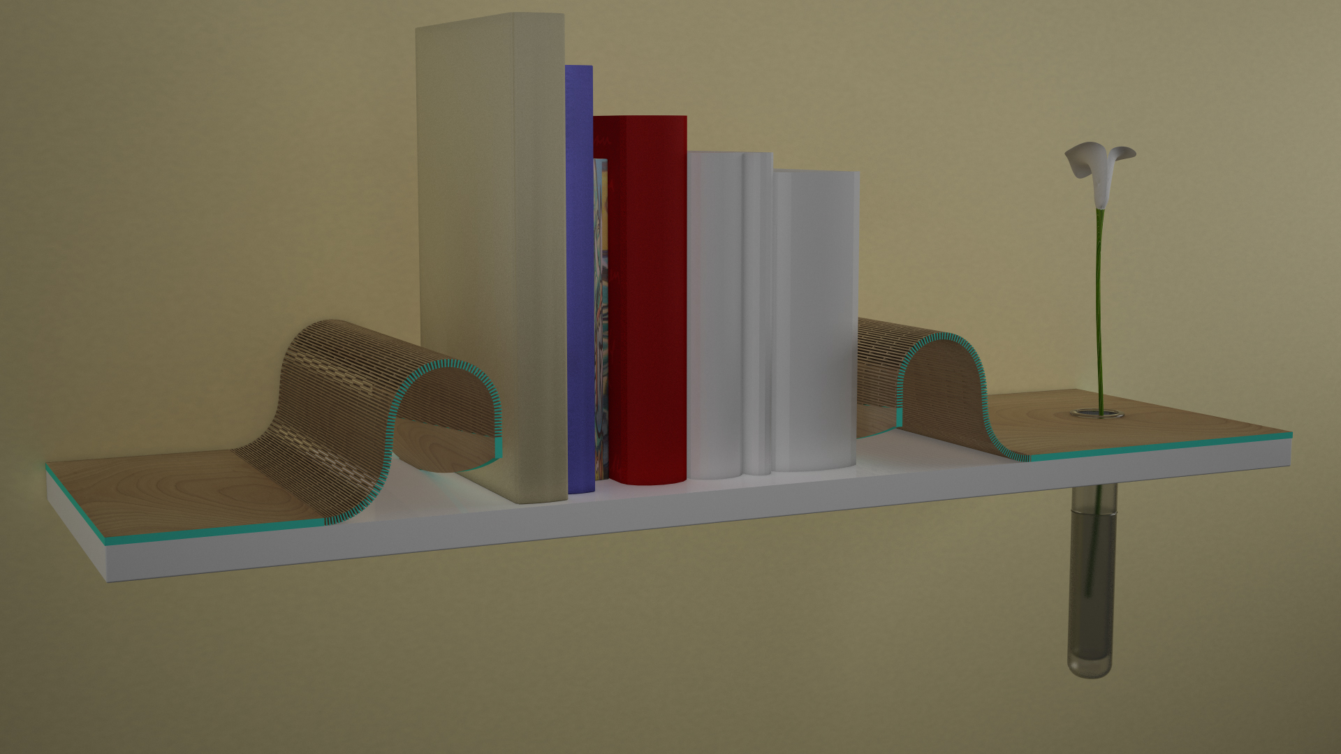 Posto un rendering di una mensola fatta. La mensola è laccata bianca, le due parti in legno sono in noce, i libri sono da decoro, la boccetta è in vetro frizzato, e il fiore non è reale ma tipo in croco..