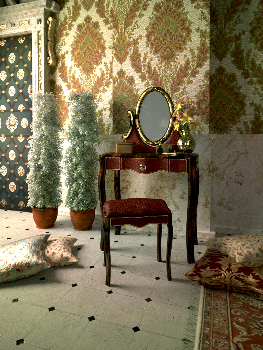 Trovo sempre un po' esagerato il Bump su alcuni materiali, come la cornice dorata dello specchio nella terza immagine, ma trattandosi di Maxwell non sono sicuro se è il bump o doveva cuocere altre 20000 ore!!!
