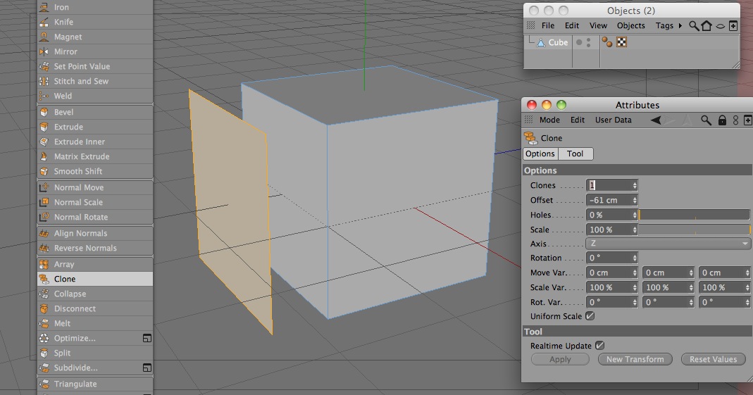 In realtà lo Split è moooooolto più comodo proprio perchè crea un duplicato del/dei poligoni selezionati e se vuoi cancellare l'oggetto originario ti basta solo un click. Mentre con la funzione Clone se vuoi, ad esempio, cancellare l'oggetto originario devi selezionarne i poligoni e poi cancellarli compiendo uno step in più.