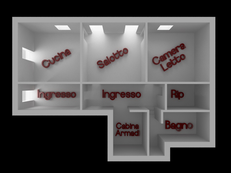 Per comodità allego due render fatti alla veloce per spiegarvi meglio: una pianta vista dall'alto con la disposizione degli ambienti segnata con testo rosso.
