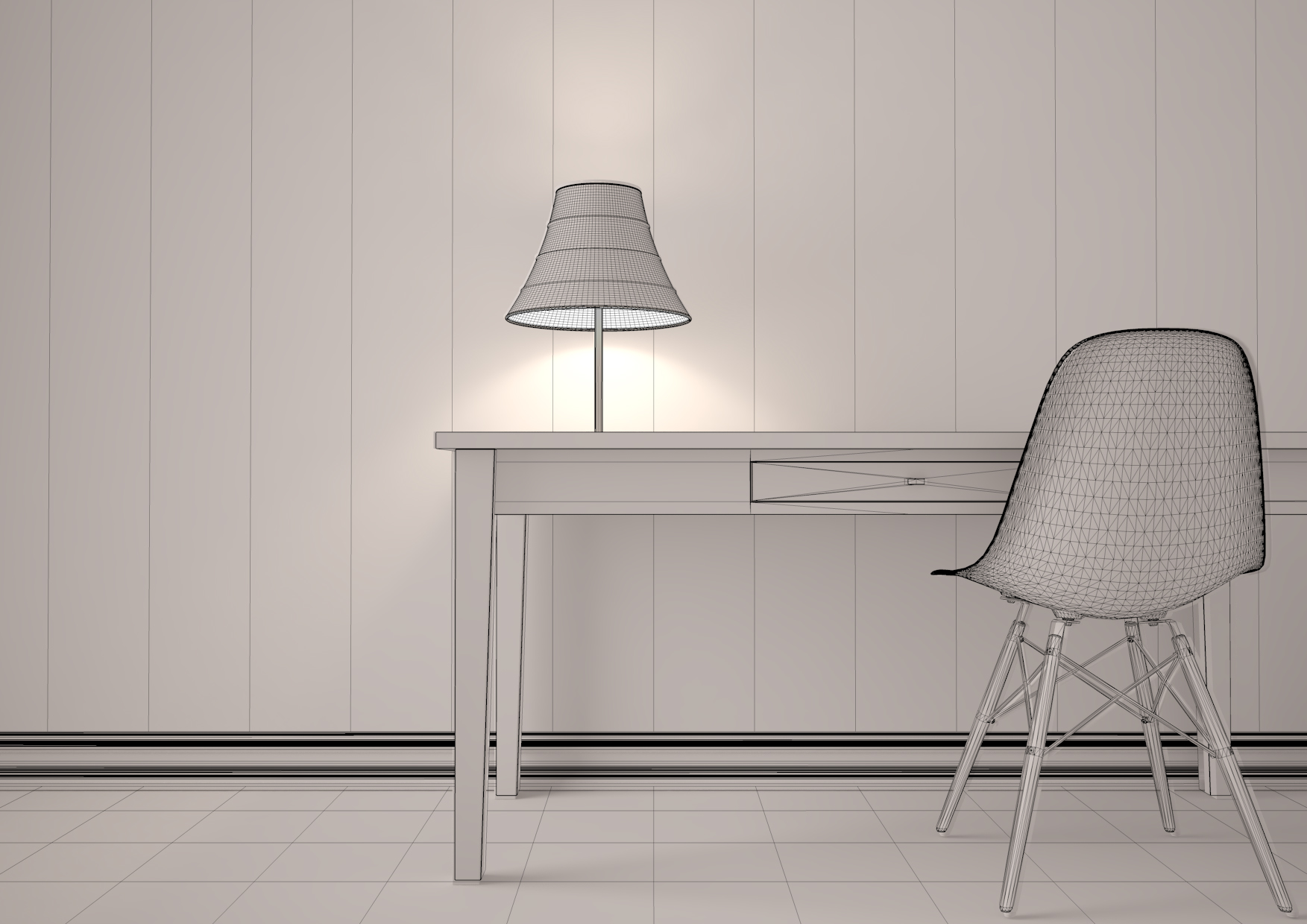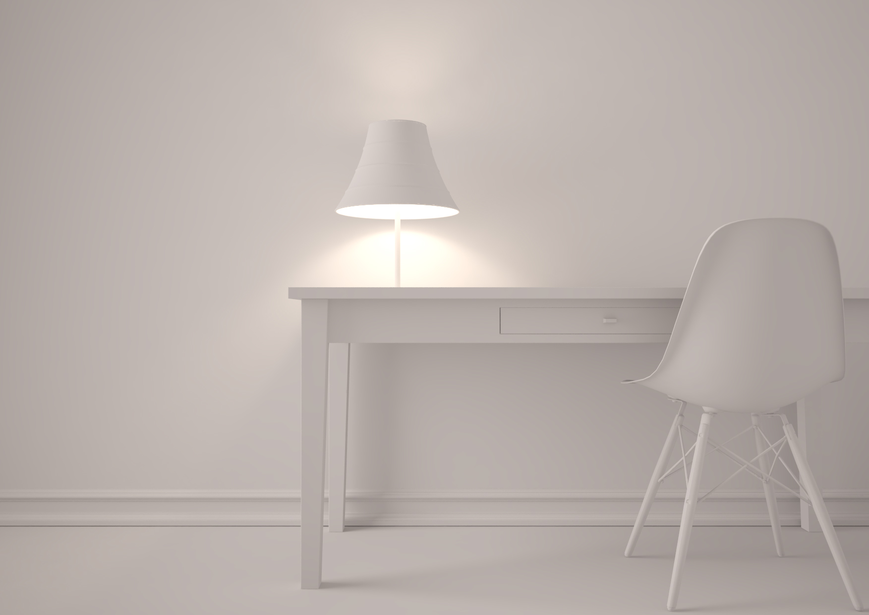 Il lavoro in questione è stato modellato in cinema, sedia e lampada a parte, illuminato con HDRI in area dome (per l'illuminazione generale) una luce area sphera per la lampada e usato una physical camera.