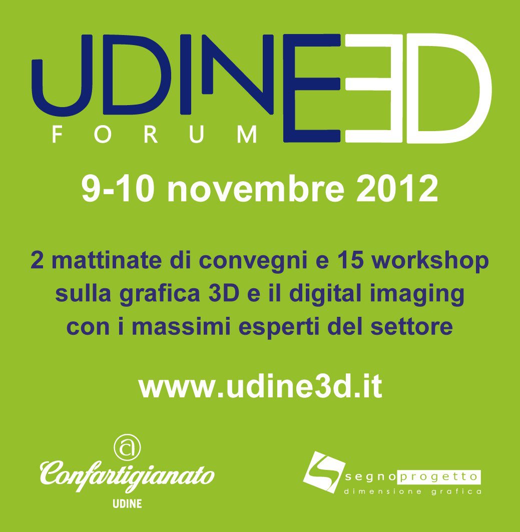 Il 9 e 10 novembre ad Udine ci sarà la seconda edizione di "Udine 3D Forum" ci saranno 2 mattinate di convegni e 15 workshop sulla grafica 3D e il digital imaging con i massimi esperti del settore tra cui : Marianna Santoni (Adobe Guru) - Daniele Angelozzi (Z-Brush guru) - Antonio De Lorenzo (Computer Grafica e 3D Artist) - Marco Mazzaglia (ICT Manager Milestone) - Gianmario Catania, Simone Vassallo, Francesco Lupo e Serena Fabiani (Rainbow cgi).