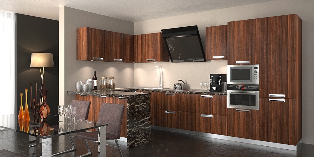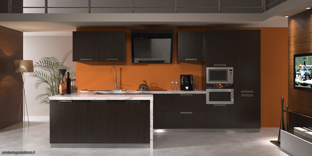 Alcune scelte stilistiche/funzionali non le condivido, e, in caso il tuo scopo fosse stato quello di creare una foto da catalogo, quindi senza limiti strutturali, rivedrei la posizione del lavandino e la penisola, ques'ultima troppo stretta per avere sia lo spazio per le gambe che la doppia apertura. Per la doppia apertura dovresti farla larga almeno 120 cm per poter ospitare due moduli, mentre per avere lo spazio delle gambe dovresti farla larga almeno 90/100 cm.