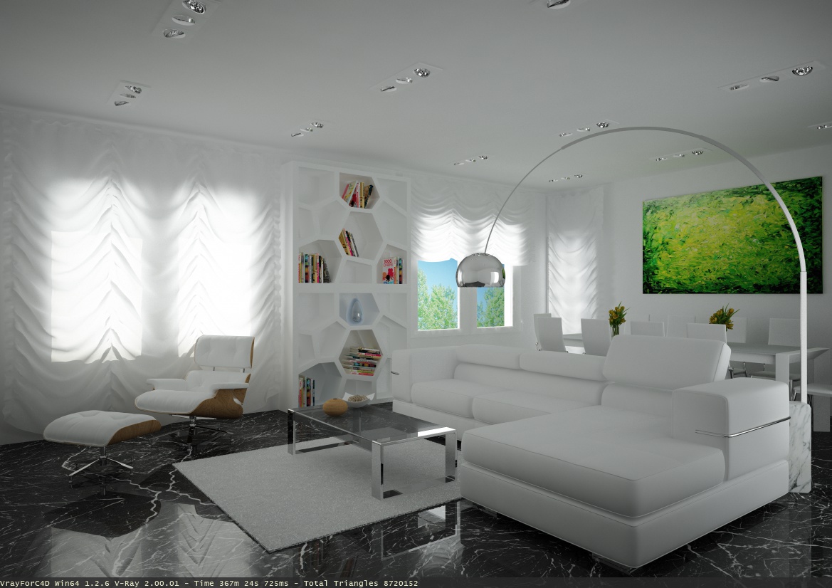 Tutto molto... Bianco ! Forse il divano o la libreria la farei di un altro colore per riprendere il pavimento.