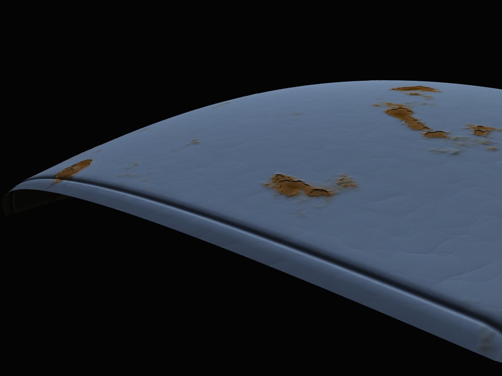 Per il materiale, se ci fai caso, nel mio file ho usato anche il canale bump ( seppur un po a caso ) per generare delle micro fratture nella vernice e per dare la sensazione di rigonfiamento. Per la texture "sporca" poi, potresti aggiungere l'altro canale "diffuse" (nel mio file adesso c'è un hdri) sempre con la ruggine, variando la frequenza e rendendolo +o- visibile aumentando l'amount del diffuse layer trasparency del primo ...