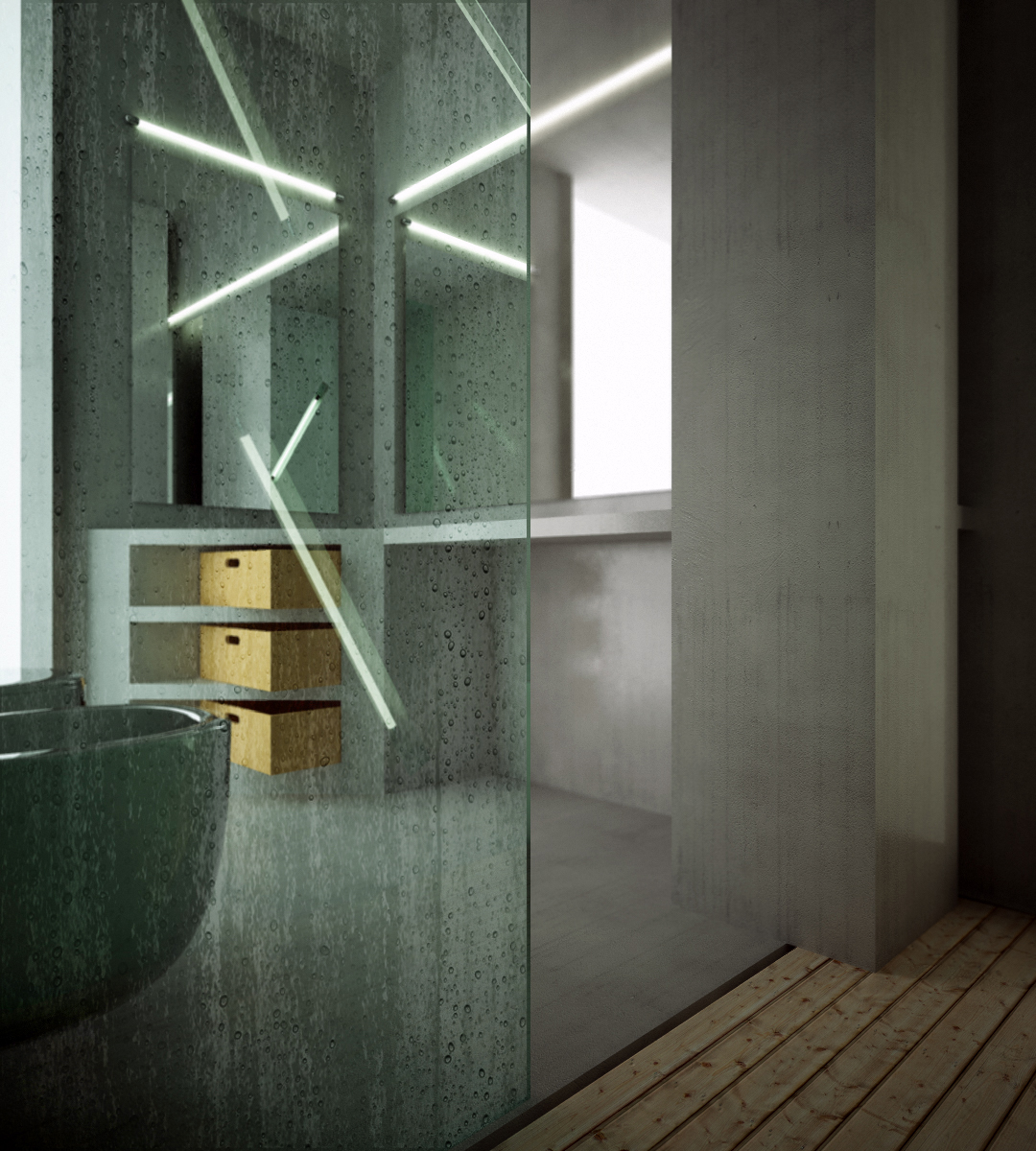 Tipo Goccioline o simile, in modo da simulare appunto un pò d'acqua o un pò di condensa sul vetro come se uno si fosse appena fatto la doccia. vi posto la mia scena e se qualche anima pia ha qualche suggerimento apprezzo volentieri bella li