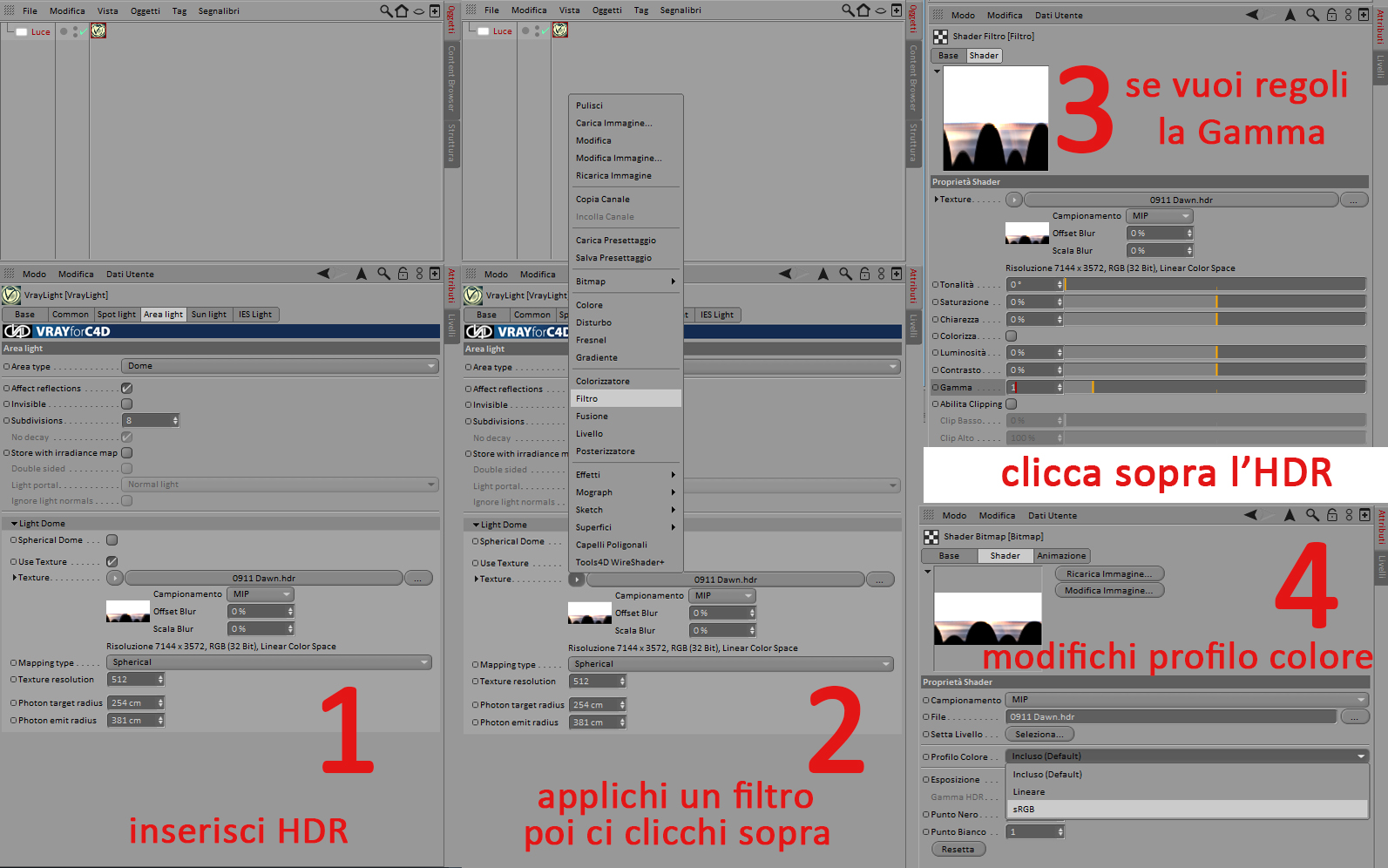 Ciao enzo, secondo me non c'è un metodo giusto e uno sbagliato basta trovare quello che fa al caso tuo. Ma smentitemi pure Comunque per quanto riguarda l'impostazione del canale devi andare nei parametri del progetto ( CTRL + d) e deselezioni Workflow lineare, una volta che andrai sulle impostazioni della light dome potrai modificare il profilo in sRGB.