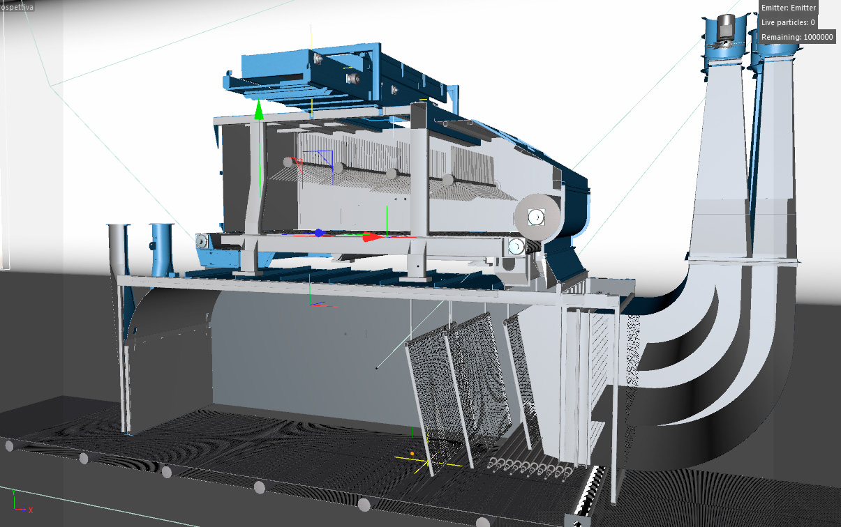Ho urgente bisogno di aiuto, ho provato in molti modi ma non riesco a trovare il sistema per poter fare attraverso le particelle un buon volume che deve interagire all'interno di una macchina dove ci sono dei pettini che ruotano e dei nastri trasportatori in cui le particelle dovranno posarsi e scorrere verso un tamburo rotante per poi cadere all'interno di un altro vano dove le stesse verranno colpite da una ventilazione che le trasporterà all'interno della macchina.