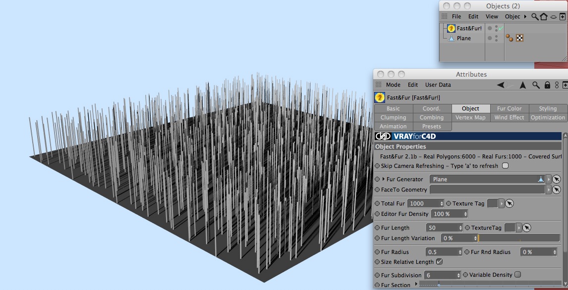 ma stai parlando dell'oggetto Fur di cinema4d oppure del tag vrayFur di vray ? il Fur di cinema non è utilizzabile con vray, che ha i propri strumenti per questo compito (VrayFur tag e Fast&Fur). Se applichi il tag VrayFur a un piano e lanci il render ottieni questo:
