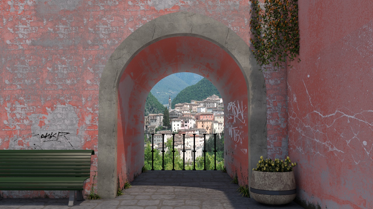 -la text grigia dell'arco si "lega" poco con la text delle pareti. ci vorrebbe qualcosa che faccia capire che sono dello stesso materiale. forse inserendo un bump uguale (tipo le fughe dei mattoni) ad entrambe le text renderebbe di più.
