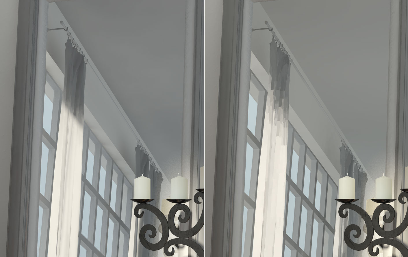 La tenda che si vede nello specchio, se faccio il render con il settaggio di default di SolidRocks, risulta squadrettata, non sfumata come nel render fatto senza SolidRocks (che mi fa comodo perché ottengo tempi decisamente inferiori con qualità lo stesso buona).