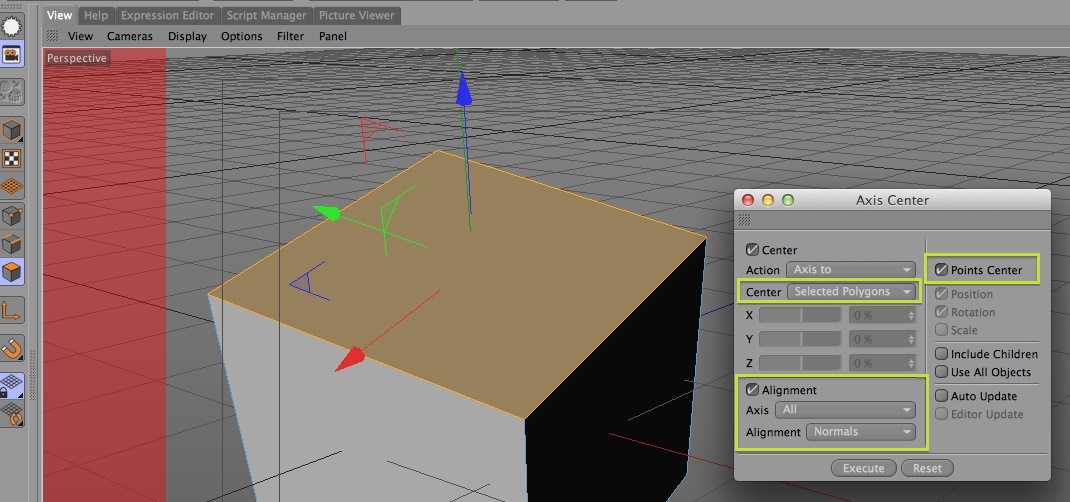 Grazie mille concittadino!visualtricks ha scritto: Altrimenti puoi farlo con l'Axis Center (Menù Mesh->Axis Center): in modalità Facce selezioni un poligono, lanci l'axis center impostato come nell'immagine e clicchi Execute.