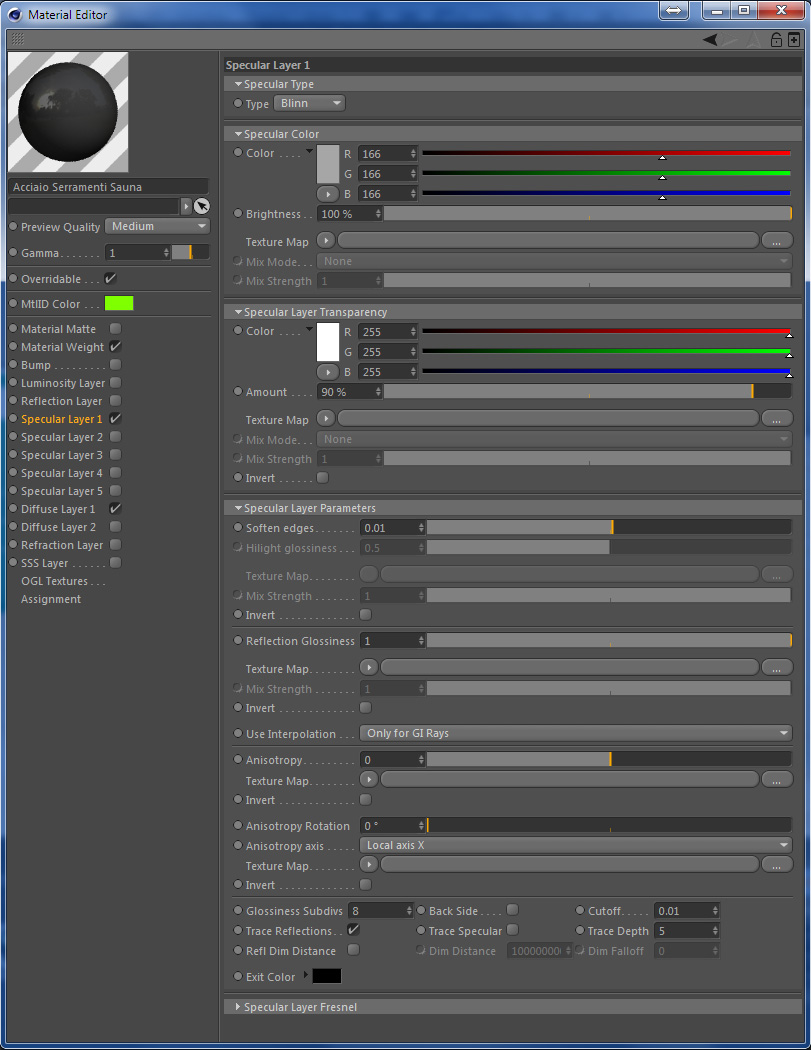 per i materiali....noto che in alcuni non hai attivato lo specula layer...e che in quelli in cui è attivato, non è attivo il "trace specular".
