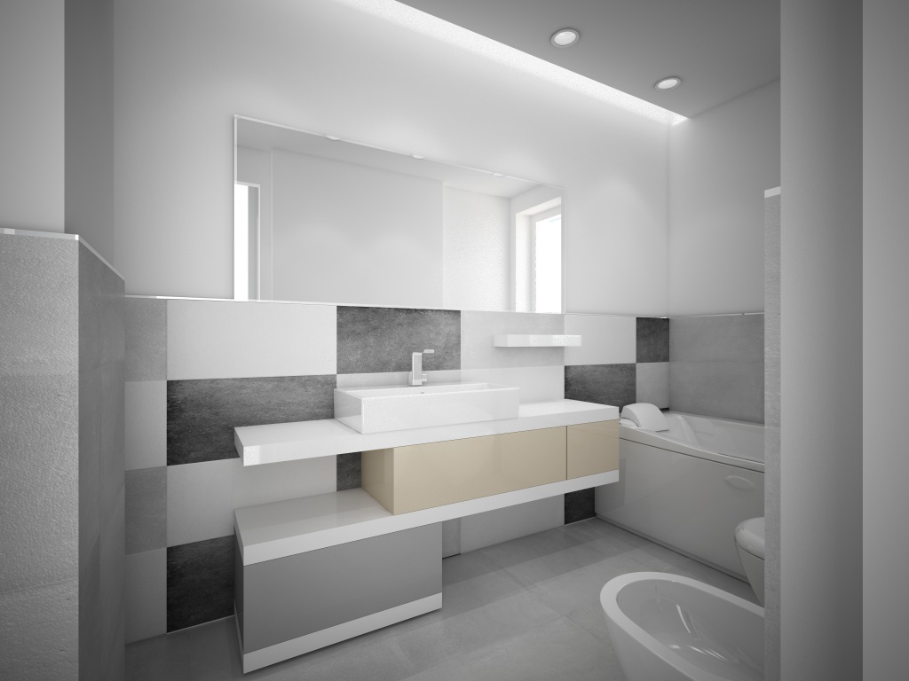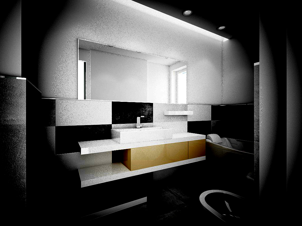 Salve sto facendo delle prove per il rivestimento del bagno. Ho un problema nel rendering si vedono dei punti bianchi molt sfocati sulla parete dove c'è il lavabo.