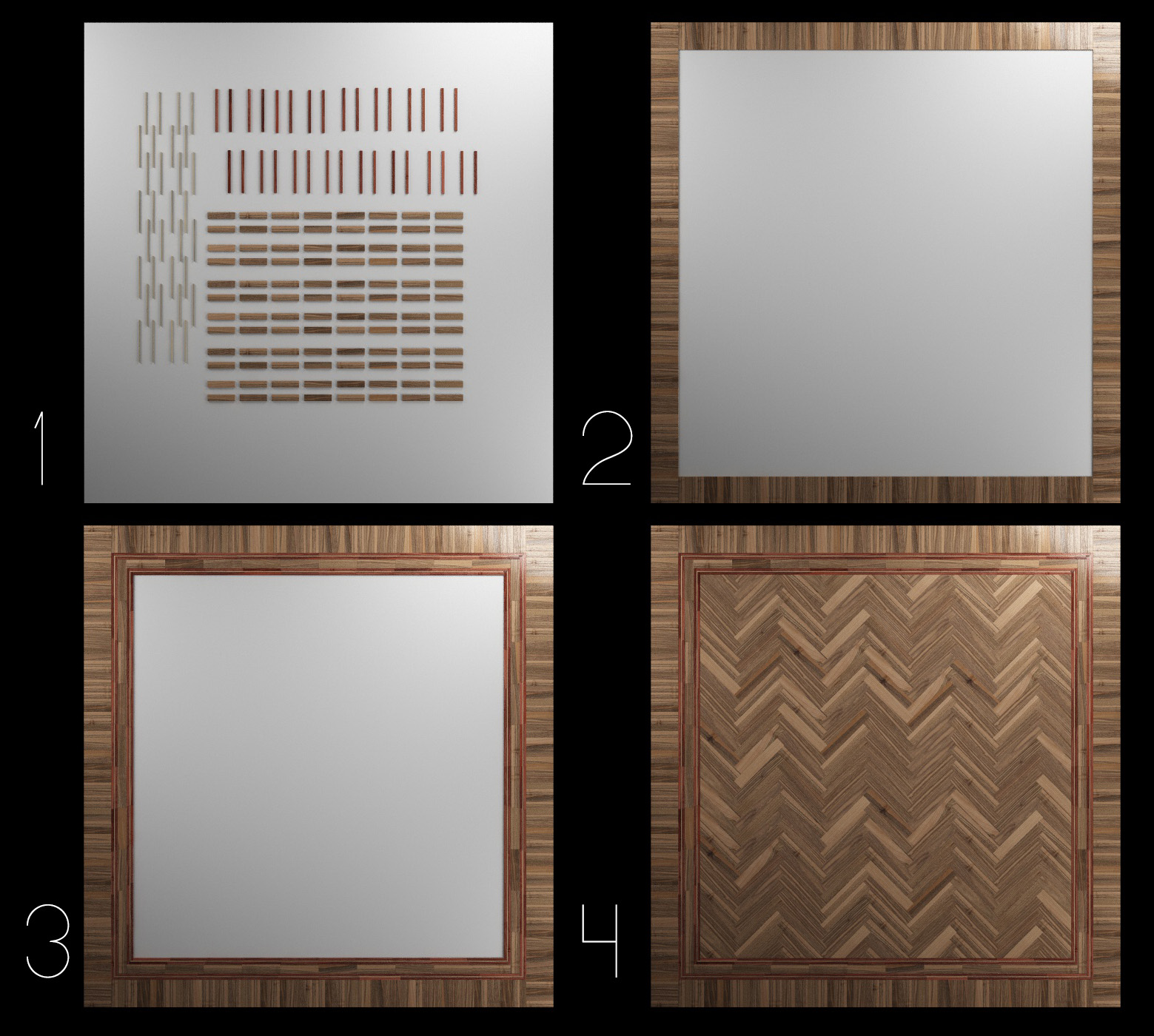 Trattasi di Parquet in Noce con inserti di acero e palissandro (mi pare). Questo l'ho modellato preparandomi una serie di listelli della misura che mi servivano e poi ho composto tutti e tre i pavimenti con Mogrpah.
