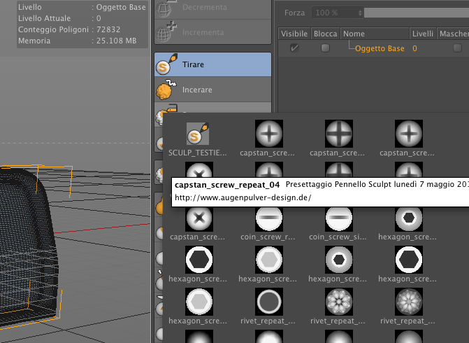 mi sono creato vari presettaggi dei pennelli con c4d r14 con lo strumento tirare dello sculpting di c4d.