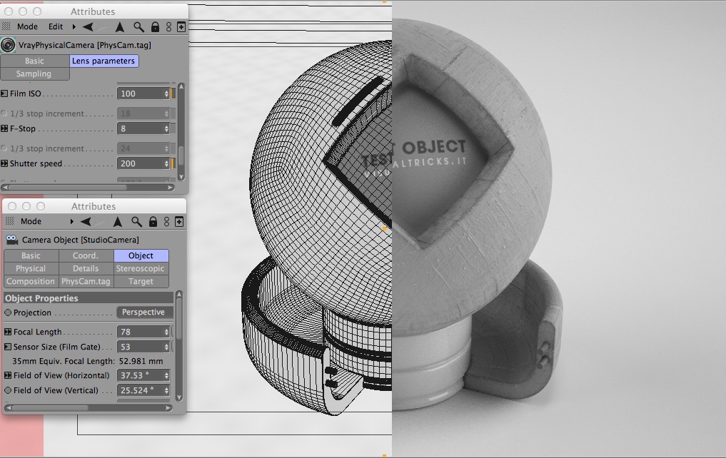 Io inizialmente non ho toccato nessun valore oltre la lunghezza focale, ed è proprio li che è sorto il problema: per far combaciare le due immagini sono dovuto andare a ritroso (e soprattutto a tentativi) dal valore di default di 36mm per la larghezza focale, fino ai 27,713mm; tale valore è uscito fuori quando mi son avvicinato ai 60° del campo vista, perché ho ipotizzato che quest'ultimo valore dovesse avere un valore puro.
