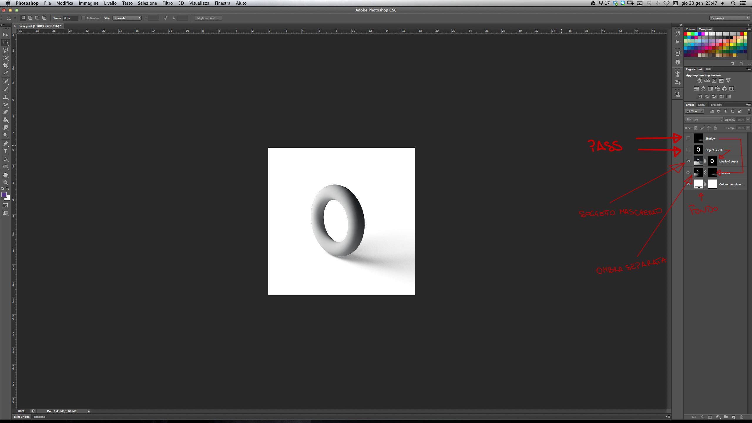 Seguendo però quello che vuoi far tu dovresti uscire con il pass obj ID che userai come maschera per il soggetto, e il pass delle ombre, che userai anche questa come maschera (poi decidi anche se vuoi separare l'ombra dal soggetto in ps, anzi, con questo metodo sono già separate, decidi quindi se unirle in un unica maschera di livello e avere quindi oggetto+ombra su livello trasparente)