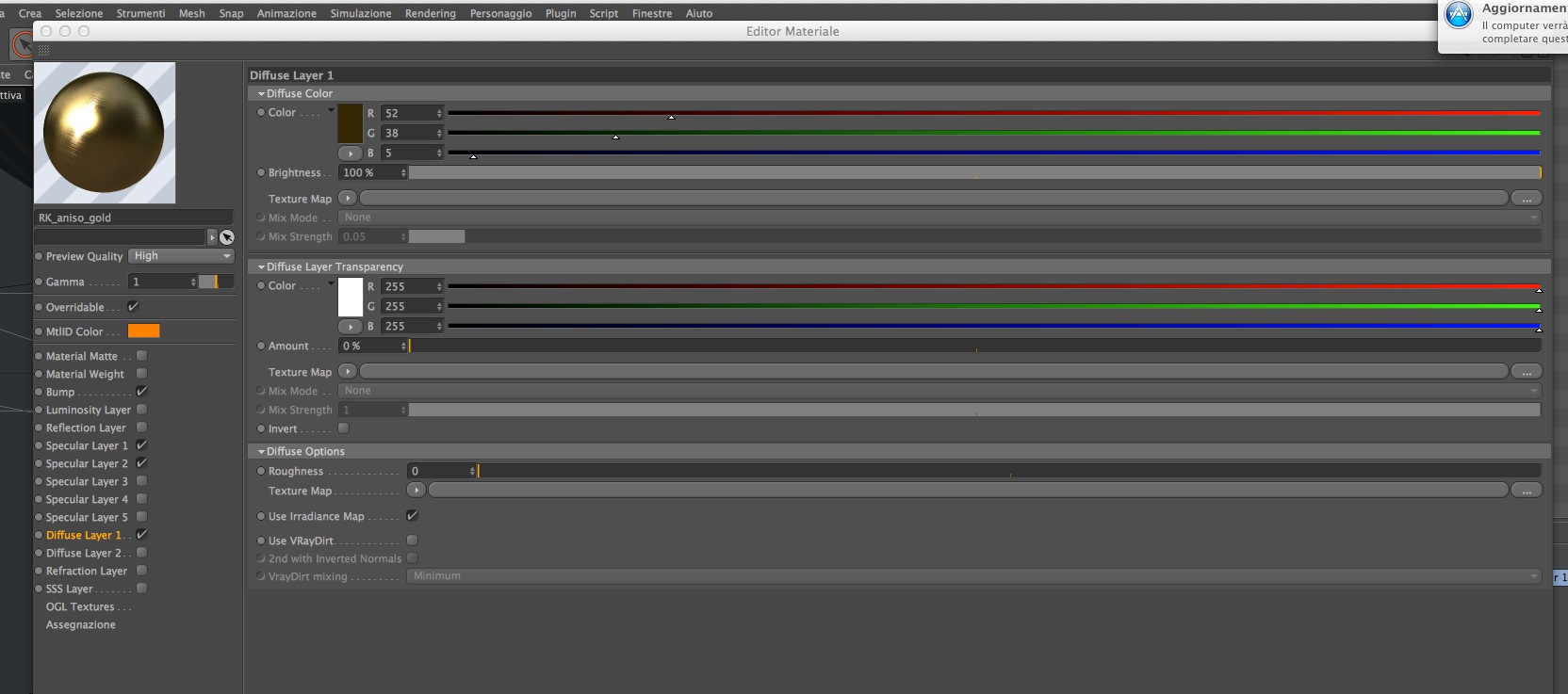Ho utilizzato materiali prefatti, trovati sul sito ufficiale di vray for c4d. Domani li posto. Grazie.