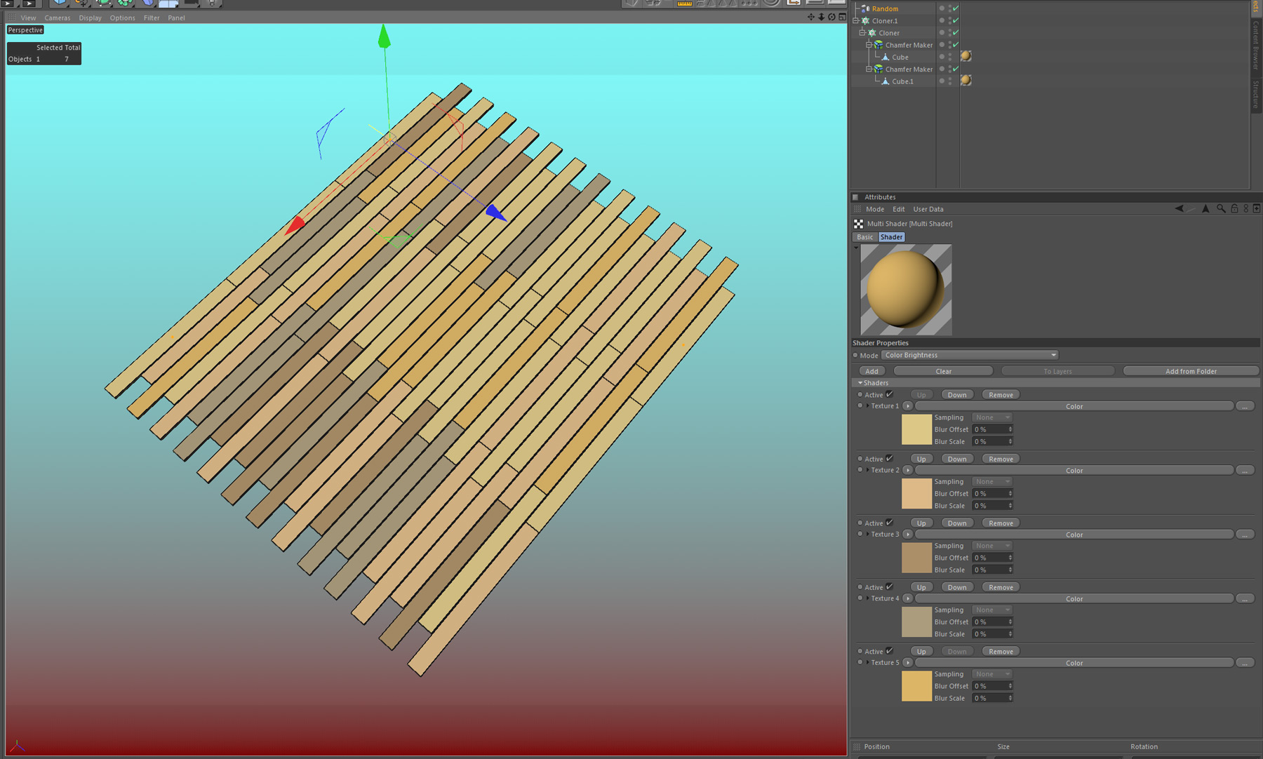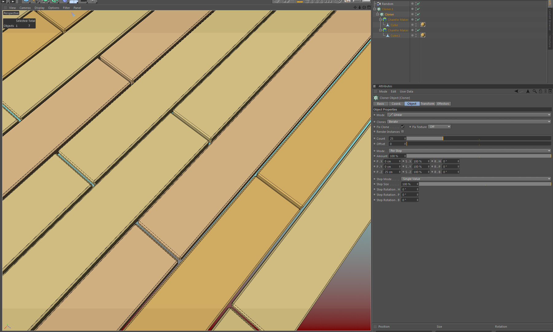 con ancora piú fantasia si taglia con il coltello un piano in modo da avere poligonalmente la distribuzione delle doghe e poi lo si usa come oggetto-referenza del cloner per moltiplicarci sopra le doghe in m odalitá object>polygon center.