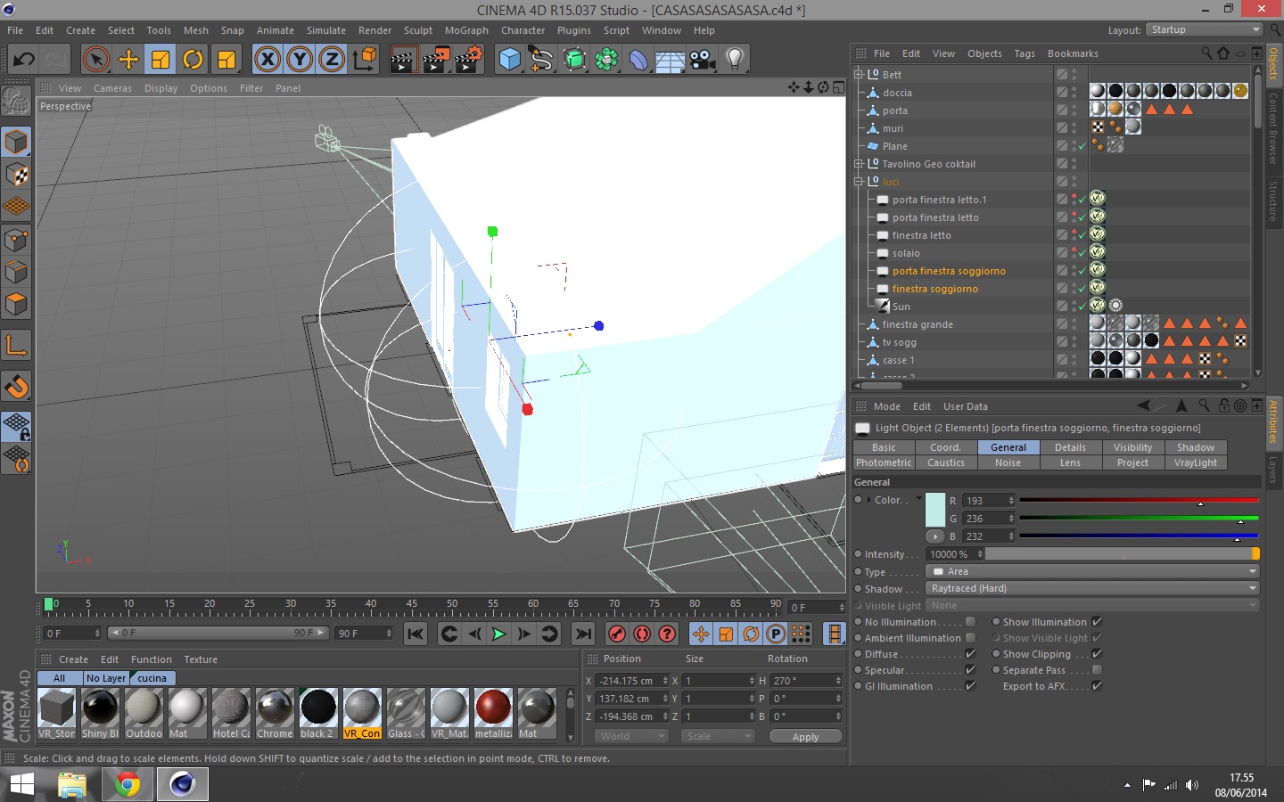 Allora ho provato con questa impostazione, poi ho fatto un render con impostazioni luce area a 100 di intensity (3 luci per l'esattezza, due quelle che vedete e una terza dall'altra parte in quanto sopra c'è un soppalco). Infine ho un sole inifinito ad intensità 600%, con la mia posizione attuale e l'ora impostata su 14.30.