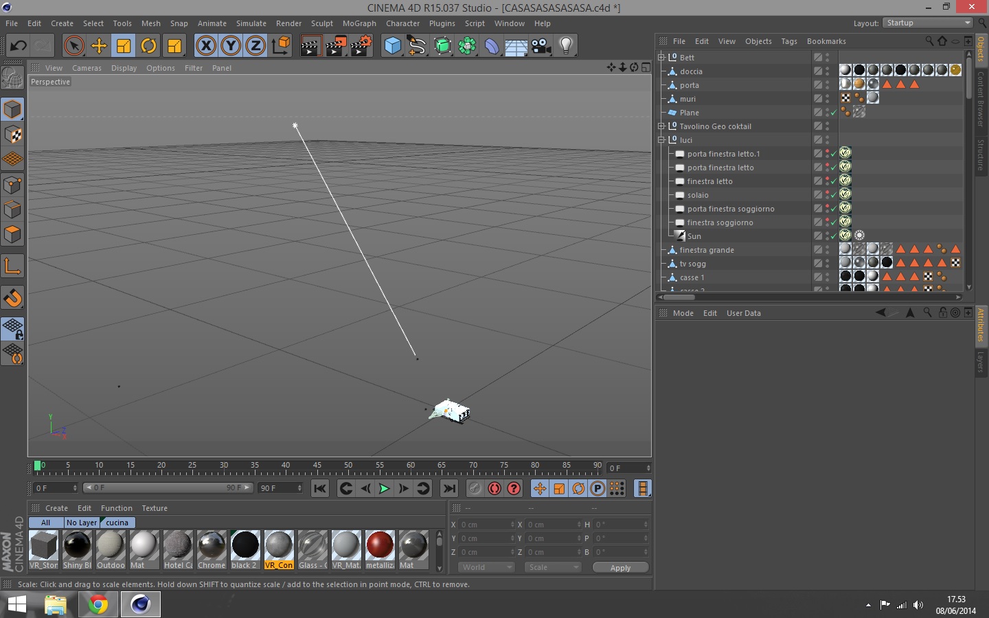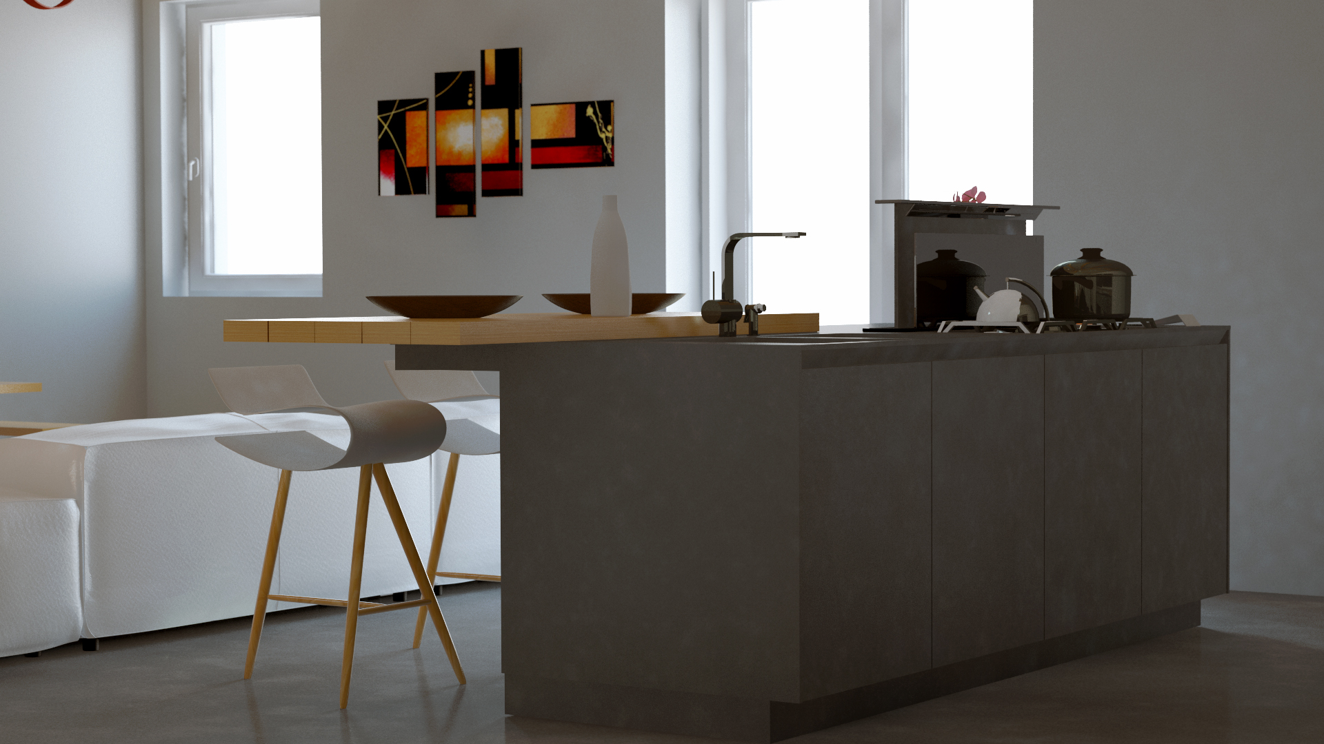Allora ho provato con questa impostazione, poi ho fatto un render con impostazioni luce area a 100 di intensity (3 luci per l'esattezza, due quelle che vedete e una terza dall'altra parte in quanto sopra c'è un soppalco). Infine ho un sole inifinito ad intensità 600%, con la mia posizione attuale e l'ora impostata su 14.30.