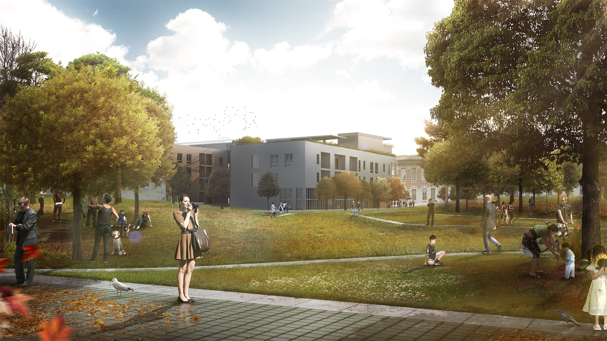 La prima è forse quella meno riuscita per quanto riguarda l'illuminazione dell'edificio, che sembra parzialmente in ombra, forse volevi simulare una giornata parzialmente nuvolosa? Poi non si capisce la parte marrone dell'edificio, quella dietro l'edificio principale grigio, c'è lo spigolo e poi, come continua? Sembra coperta da un velo, boh!