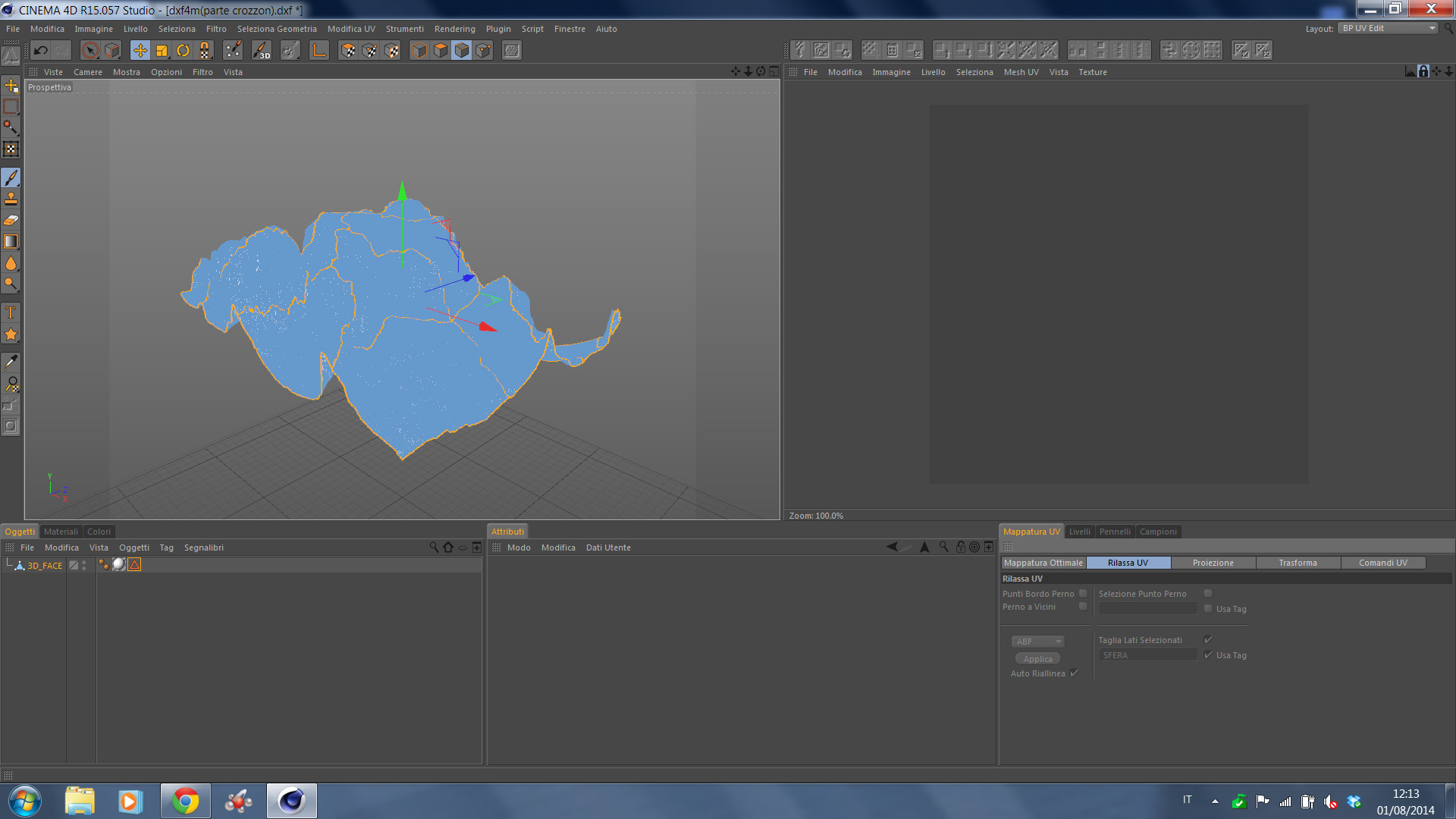Scusa, ho visto adesso che non può funzionare, perchè l'oggetto non ha coordinate UV (se guardi bene manca il tag) quindi cinema non sa da dove partire :) Fai così: clicca con il dx sul tag del materiale che hai assegnato all'oggetto e scegli dal menù Assign UV Coordinates, poi ti sposti nel layout UV Edit e procedi con la proiezione e il rilassamento.