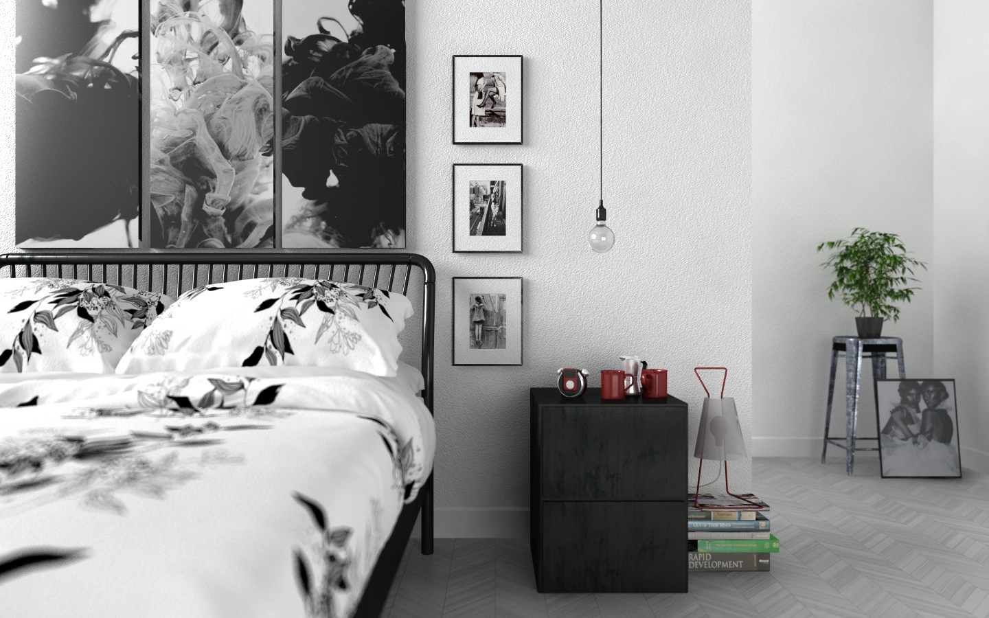 Per finire, la mia fissa... illuminerei di più il corridoio, per far staccare di più la parete del letto da quella di fondo, oppure andrei a scurire quest'ultima.